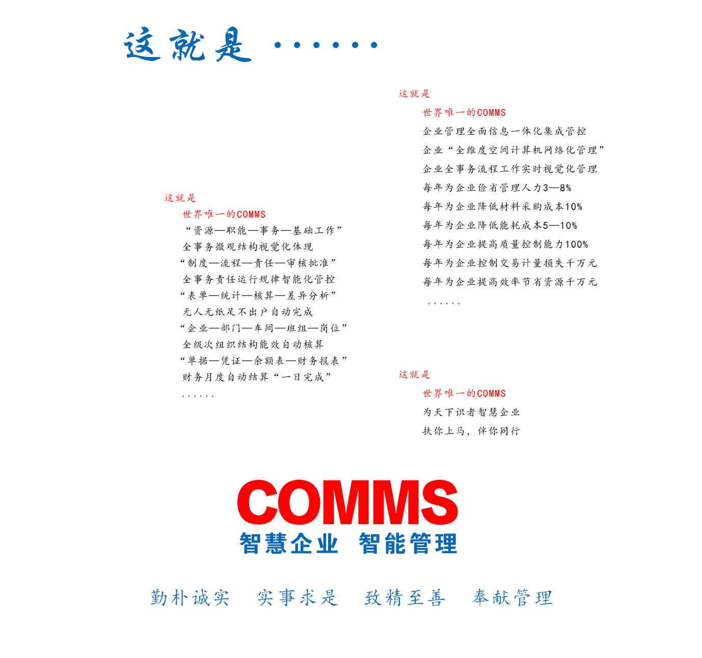 在一个成败交集、争论不休的而且企业必将走向现代信息化管理的建设中,你是否还迷信在以传统理论和西方思想方法占主导的企业信息化建设方法中,你是否也人云亦云的随波逐流,你是否已在探寻未来新的方向与方法,渴望在这个纷繁复杂的世界中察亮了自己的眼睛,COMMS在企业信息化建设一切方法与方向上给你特殊的能力来坚定你的信心。COMMS就是你的企业未来管控的一系列可能、趋势与事件。曲折、进步,随着时间的流逝,所有的管理职能与基础工作事务都会各就各位,更加精细与专业,最终形成一幅关于未来企业管理的完整画面,这就是“COMMS企业全职能事务流程基础工作专业精细智能化管控信息一体化集成平台”,一步到位,步步到位。扶你上马,牵缰送程伴你行!